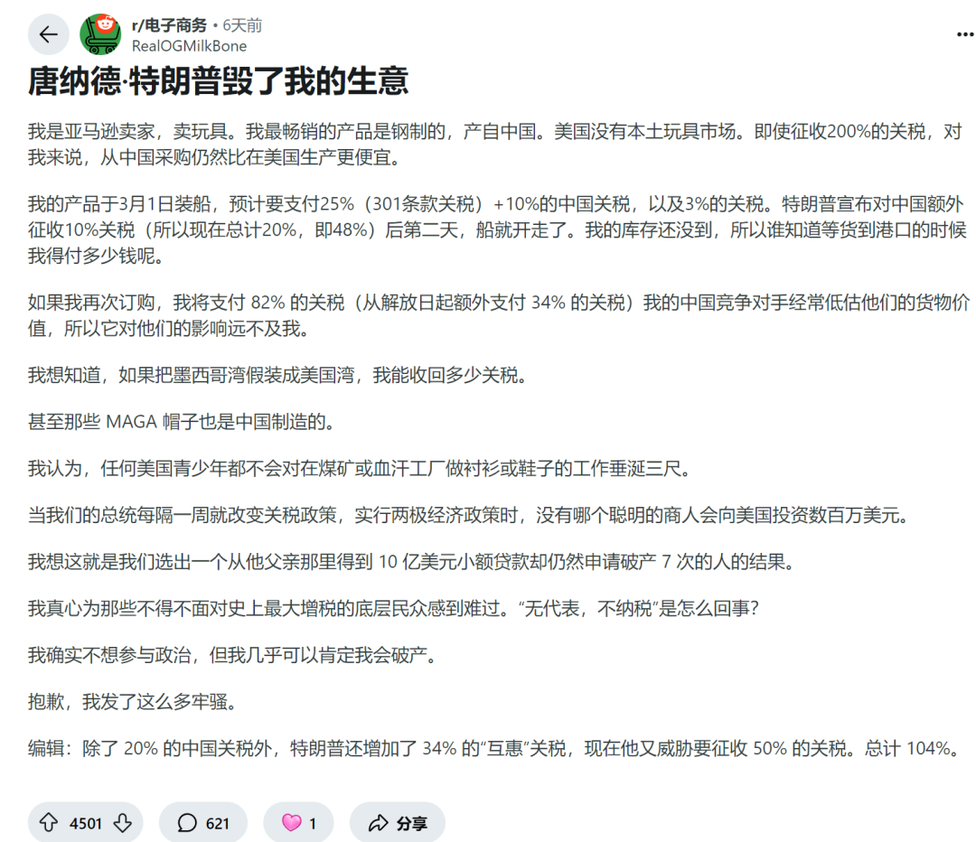 一位玩具品类的美国跨境电商卖家,在reddit ecommerce 上,发布了一篇言辞激烈的长帖,对特朗普的关税政策予以猛烈抨击。