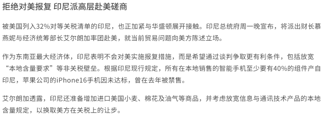 关税政策颁布当天,东南亚货币普遍贬值,泰铢兑美元下跌0.8%,马来西亚林吉特、印尼盾等也大幅走软。华尔街机构批评供应链转移策略沦为“笑话”,例如从中国迁至越南的企业需承受46%的关税,投资回报率大幅缩水。那些原本试图通过将供应链转移至东南亚,再转出口到美国的中国企业,如今发现美国对越南、墨西哥等中转国加征高关税,这条路已被堵死,只能被迫重新布局产业链。而美国的关税政策调整,使得东南亚各国面临着新的挑战与抉择。他们既要考虑与美国的贸易关系,又要顾及与中国的合作。“毕竟,两边都惹不起。”美东时间4月8日,越南代表团与特朗普团队进行谈判,越南同意将美国商品进口税降至 0%,提高进口门槛至 20 美元,并管控来自中国的转运货物。