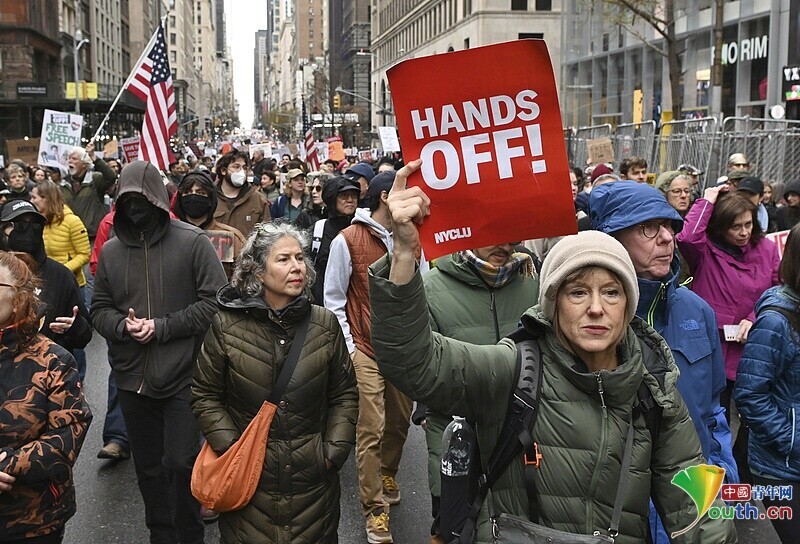 与此同时也有大批抗议者涌上街头抗议特朗普“一意孤行”的关税政策。